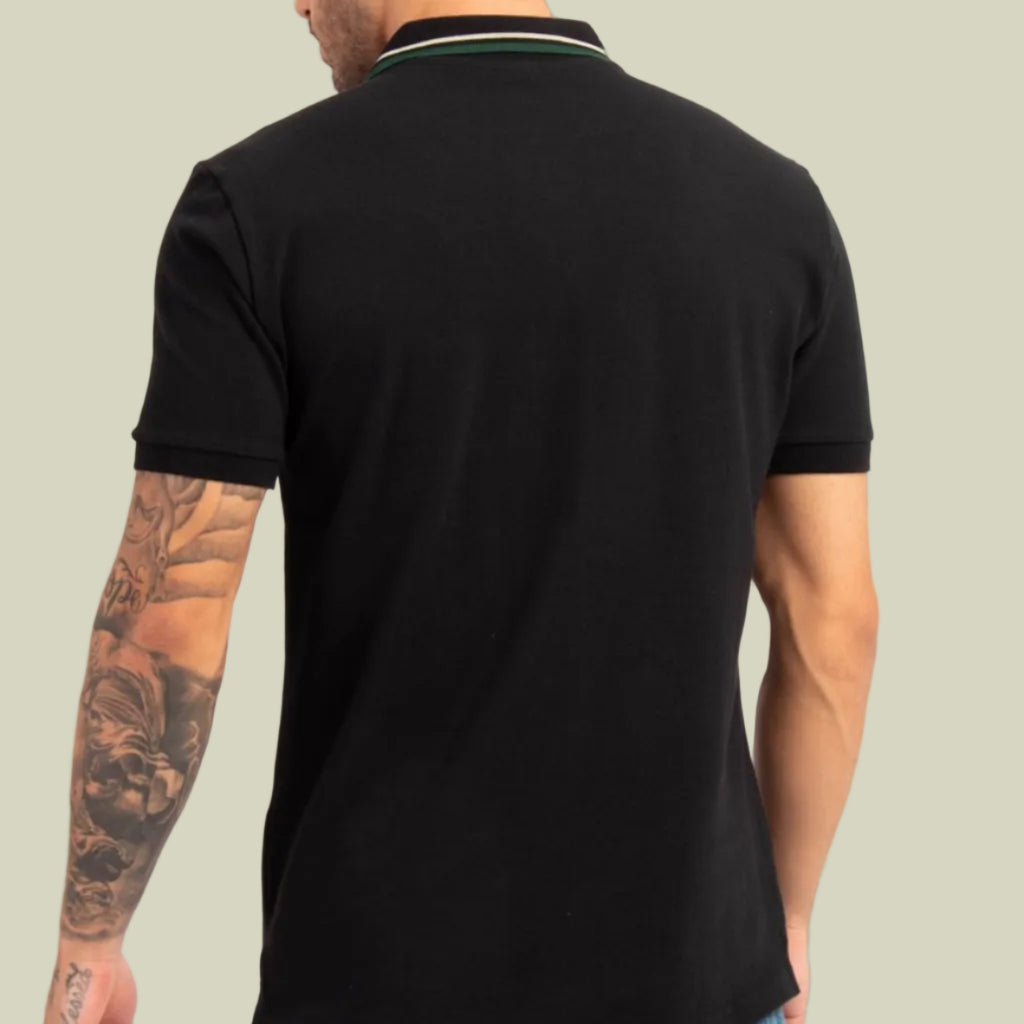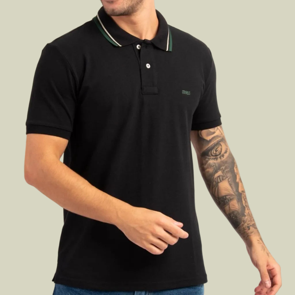 Descricao Camisa polo na cor preto, gola polo com detalhes friso fino na cor  branco e verde. Manga curta. Detalhe bordado do logo da marac do lado esquerdo do peito.