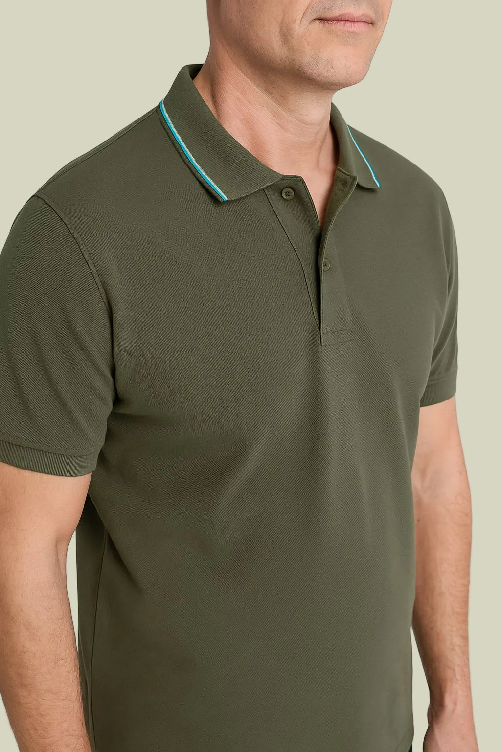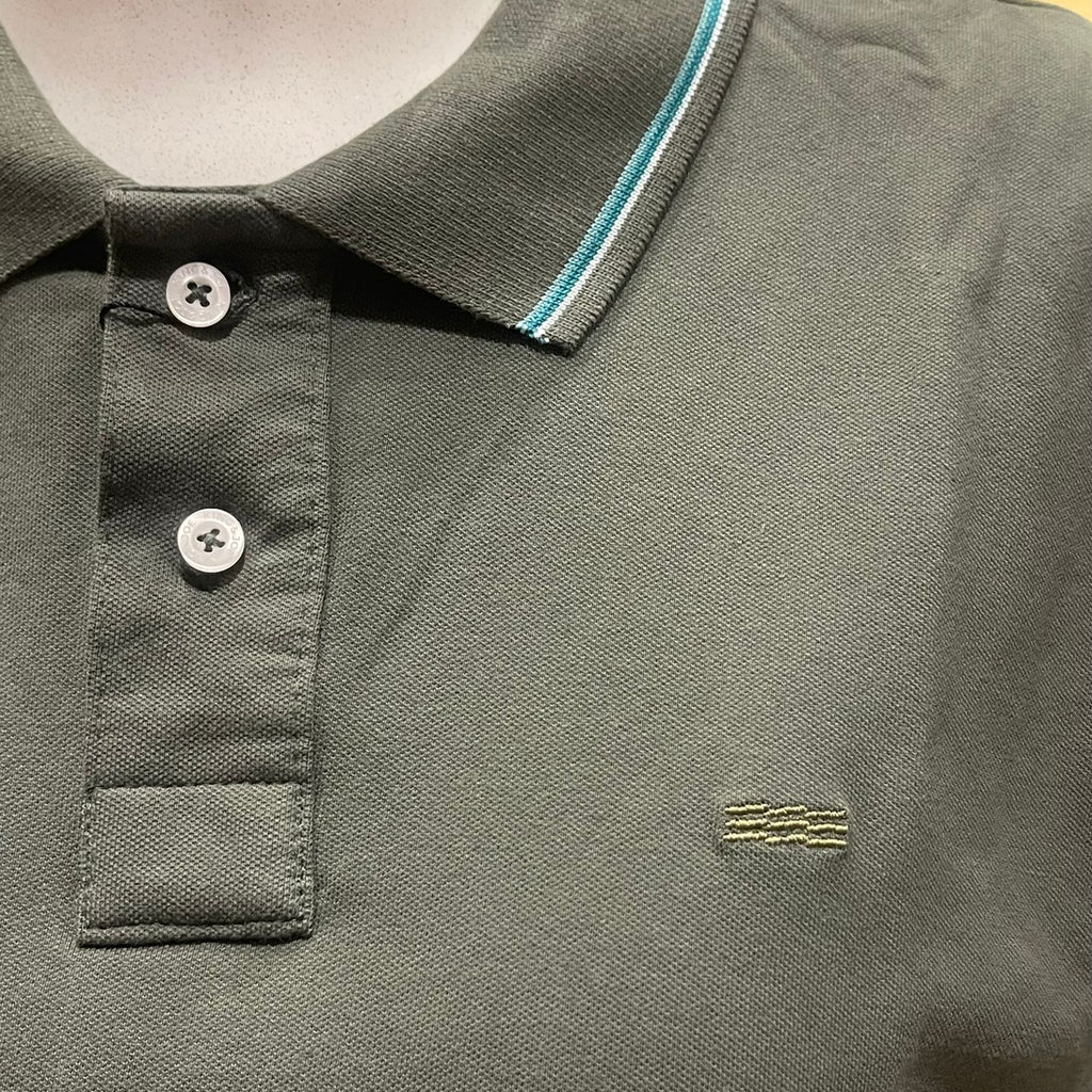 | Descricao | Camisa polo em piquet na cor verde musgo, gola polo com friso degrade branco e azul. Manga curta. Bordado da logo da marca do lado esquerdo do peito. |