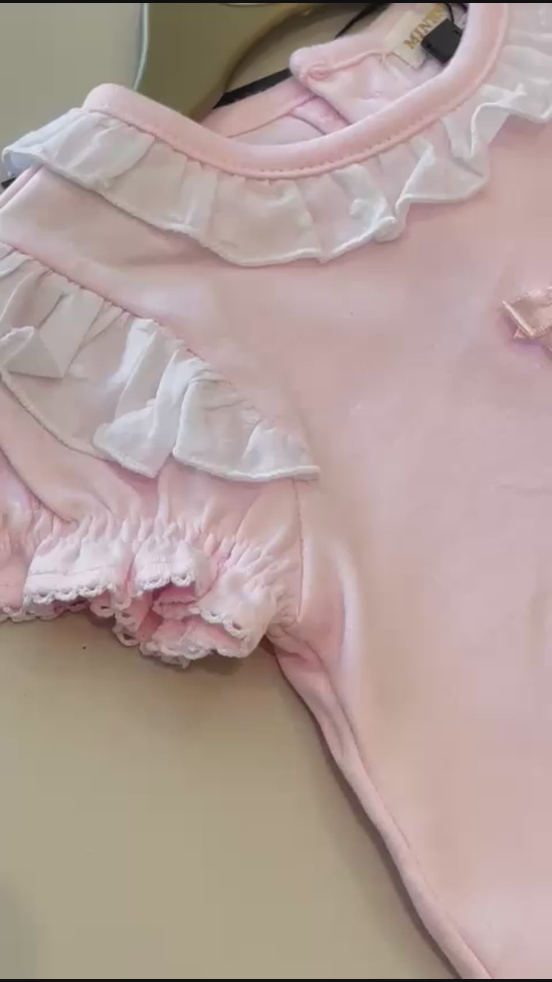 Descricao Kit de blusa na cor rosa com decote redondo com babadinho branco, nos ombros um babadinho na cor branco, manga curta com elastico. Na frente detalhe de um lacinhos com medalha de coracao na cor dourado.Atras fechamento com botoes. Calca na cor rosa, cos com elastico na cor branco e detalhe de babadinho e um lacinho, na final do comprimento da perna da calca tem elastico e um lacinho em cada perna.