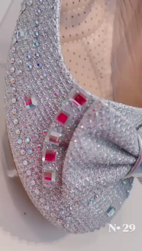 | Descricao | Sapato estilo sapatilha fechamento c/ fivela prata. Na cor prata com pedras e strass por toda a peca. Detalhe de lacinho. |